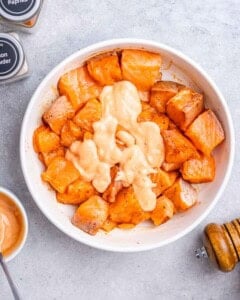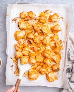 The sweet-spicy flavors of bang bang sauce work so well with seafood like shrimp and salmon. Mayonnaise helps to tone down the spicy flavors and gives this dish a deliciously creamy texture that you’ll love. By cutting the salmon into chunks and baking it at a high heat, it cooks super quickly, so you’ll have dinner on the table in no time. This dish is easy to make, high in protein, and perfect for meal prep.