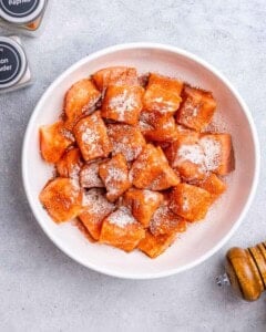 Step 2: Add the cubed salmon to a bowl, sprinkle with the seasonings, and toss to coat.