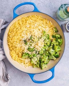 Step 4: Return the broccoli to the skillet with the cooked cheddar orzo and stir to combine.