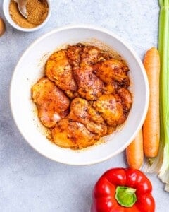 Step 1: Place the chicken thighs in a large bowl and add the seasonings and oil. Use your hand to rub the pieces, evenly coating them on all sides. Allow the chicken to marinate for at least 2 hours, in the fridge (overnight is best!).
