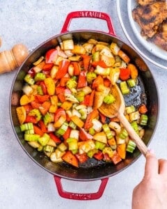 Step 4: To the same preheated skillet, add the onion, carrots, celery, and pepper. Sauté for 5 minutes. Stir in the coconut sugar, paprika, and flour.