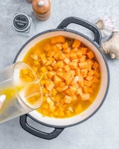 Step 1: Heat the coconut oil in a pot over medium heat. Sauté the onion, garlic, ginger, and carrots for 5 minutes. Add the sweet potato and the stock. Bring the soup to a boil, then reduce to a simmer.