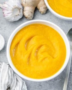 This creamy Carrot Ginger Soup is packed with the fragrant flavor of ginger and garlic. Featuring carrots and sweet potato simmered in broth and blended until velvety. Served up with a swirl of yogurt to bring it all together.