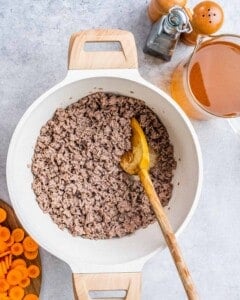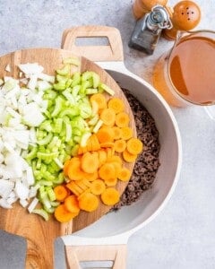 Step 2: Once the meat is no longer pink, stir in the onion, carrots, celery and garlic. Cook until the veggies soften, around 6-8 minutes.