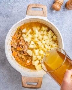 Step 4: Add the potatoes and pour in the broth. Bring the soup to a boil, then reduce to a simmer. Cook for 25-30 minutes, or until veggies are tender.