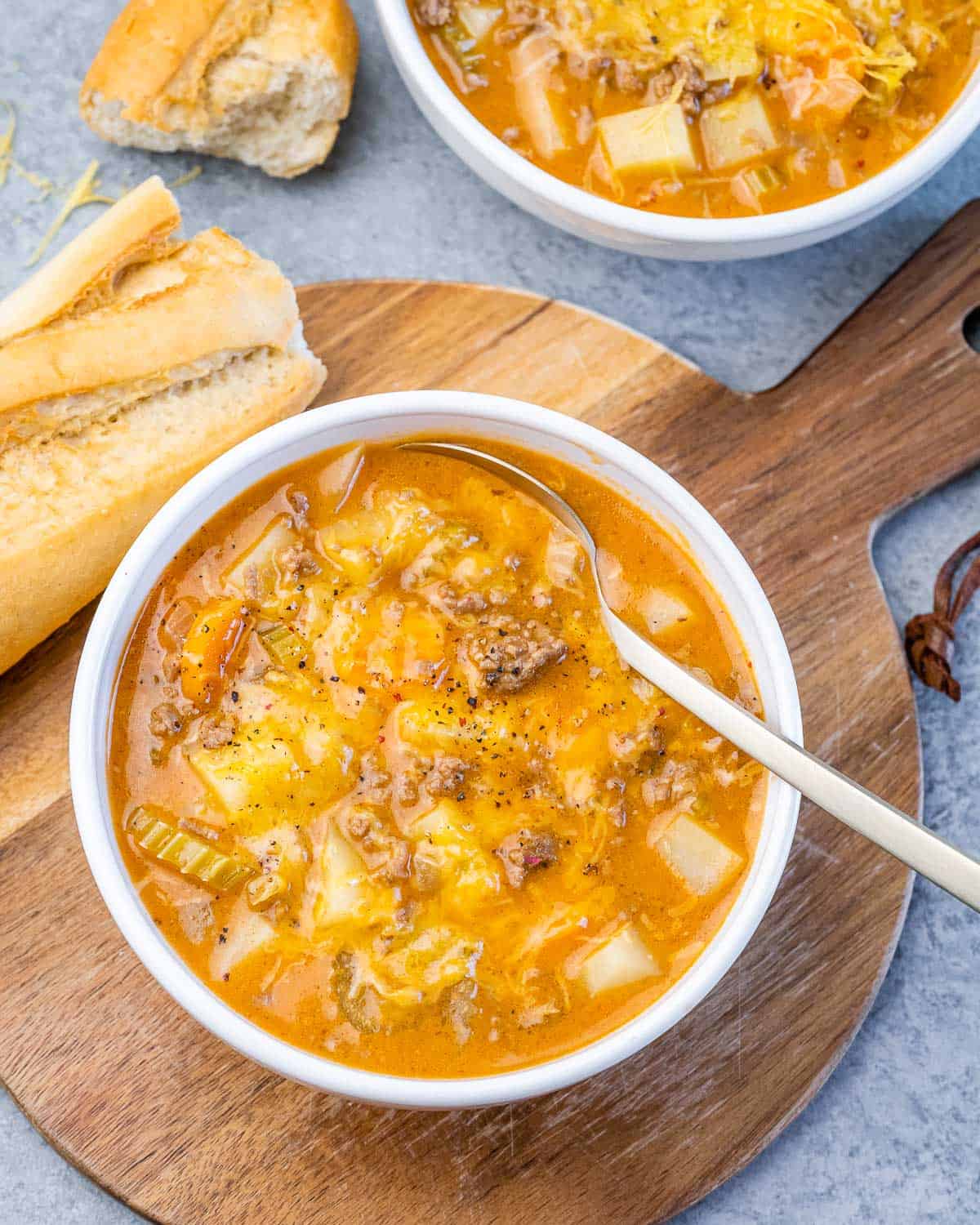 This Cheeseburger Soup has all the classic flavors of a cheeseburger in soup form! Lean ground beef is sautéed with carrots, celery, and onion, then simmered in beef broth to form the flavorful base.