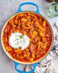 This dish, also known as Paprikás Csirke, is a Hungarian classic. Often served with egg noodles known as nokedli for a comforting, rustic dinner, it goes equally well with crusty bread for mopping up the sauce. This recipe is perfect for casual dinners with the family or for quick meals when you’re hosting.
