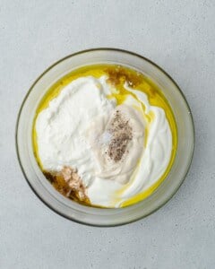 - Next, add in the 1 cup Greek Yogurt, 1 cup light sour cream, ¼ cup avocado oil-based mayonnaise, 2 tablespoons fresh chopped chives, 1 tablespoon Worcestershire sauce and Salt and pepper to taste. Mix well to combine.