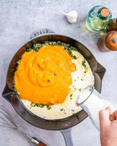 Add the pumpkin puree and milk, whisk until smooth. Turn the heat down to medium-low and stir in the cheese. Season with salt and pepper. Stir until the cheese has melted in.