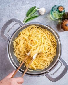 • While the pasta cooks make the sauce. Heat the 1 tablespoon olive oil in a large skillet over medium heat. Saute the 4 cloves garlic (minced) and 6-8 fresh sage leaves (finely chopped) for less than 1 minute.