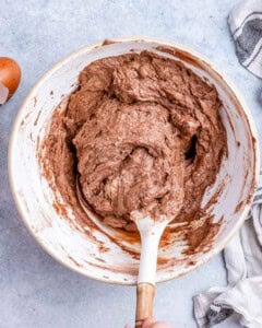 Step 4: In a separate bowl, combine the flour, cocoa powder, and baking powder. Sift the dry ingredients over the butter mixture. Whisk together by hand, don’t overmix.