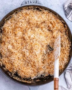 Step 6: As the brownie is cooling, make the pistachio filling: Chop the kataifi pastry, then add it to a large pan over medium heat with the oil. Stir constantly for 10-12 minutes until the pastry is golden and crisp. Don’t rush this step!