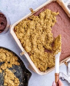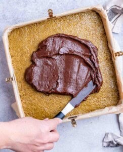 Step 2: Now make the brownie base: Preheat the oven to 350°F and line a 9 x 9-inch square pan with parchment paper.
