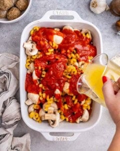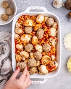 Step 1: Preheat the oven to 425°F. Use an extra-large baking dish, and add the pasta, mushrooms, marinara sauce, and stock/broth. Add minced garlic as much as you like. Stir well to combine. Nestle in the thawed meatballs.
