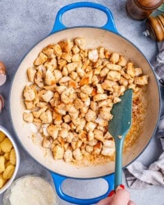 - Heat the 1 tablespoon olive oil in a deep pan over medium-high heat. Add the 1 pound chicken breast (diced) in a single layer and season with Kosher salt and pepper and ½ teaspoon garlic powder. Cook until cooked through and golden.