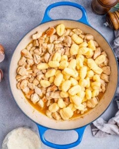 There’s no need to pre-cook the gnocchi before adding it to the pan. Cooking the gnocchi directly in the chicken stock releases some starch, which helps the sauce to emulsify nicely.
