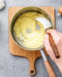Step 3: Add the flour-broth mixture and stir continuously for 1 minute. Add the milk little by little, stirring continuously until no visible lumps remain. Season with salt and pepper and remove from heat. (If at this point you see lumps in your sauce, transfer it to a blender and blend until smooth.)