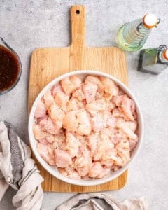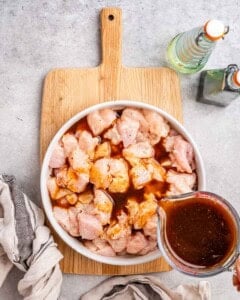 Step 2: In a jug, whisk all the hoisin sauce ingredients. Pour 2 heaping tablespoons of sauce over the cubed chicken and mix well. Let it sit on the counter for 15 minutes before cooking.