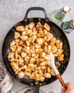- Heat a large non-stick skillet over medium heat (If the pan is not non-stick, then drizzle a bit of sesame oil). Add the chicken in a single layer and cook, undisturbed, for 4-5 minutes, to brown. Stir and continue to cook for 4-6 minutes, or until fully cooked through.