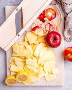 Step 3: Peel the apples and use a mandoline to thinly slice, discarding the core. Quickly squeeze over the lemon juice (to prevent the apples from browning) and toss with the lemon zest.