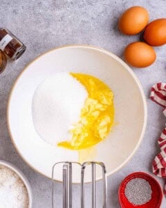 Step 1: In a mixing bowl, cream the butter and sugar with electric beaters until combined. Mix in the eggs and vanilla extract.