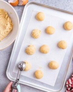 Step 5: Use a small ice cream scoop to scoop the cookie dough into balls. Place on the prepared sheet pan with some space in between.