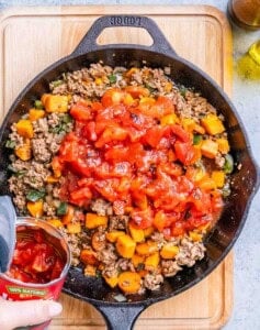 - Add 1 pound lean ground beef or ground turkey. Break apart with a spatula and cook until browned, about 6-8 minutes. Season with Kosher salt and black pepper.
