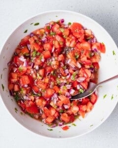 Pico de gallo is a fresh Mexican salsa made with chopped fresh tomatoes, onion, cilantro, and lime juice. It’s also known as salsa fresca because it’s not blended or cooked. Everything is diced and mixed together so the ingredients stay bright and flavorful.