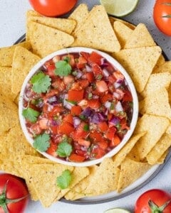 This recipe for Copycat Chipotle Pico de Gallo is fresh, simple, and light with a hint of spice. Packed with juicy tomatoes, sweet red onion, and fragrant jalapeño, it’s easy to make, ready in 10 minutes, and pairs well with burrito bowls, tacos, or as a dip for crunchy tortilla chips.