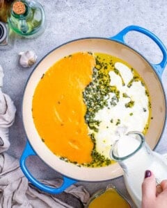 Step 2: Add the milk, broth, pumpkin puree, and seasonings. Stir until well combined.