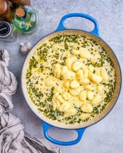 Yes! Firstly, check that the gnocchi you buy are vegan (many are). For the sauce, choose an unsweetened plant-based milk and vegetable broth. To garnish, swap out the parmesan for nutritional yeast or a vegan cheese alternative.