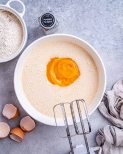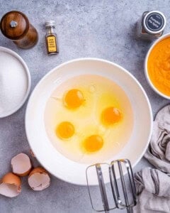 In a separate bowl, whisk the eggs and coconut oil with electric beaters. Add the sugar and vanilla and whisk until pale and creamy, around 60 seconds. Add the pumpkin puree and whisk for 10-15 seconds more to incorporate.