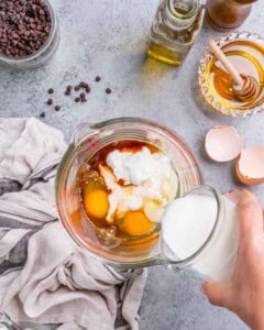 Mix the wet ingredients: In another bowl, whisk the milk, honey, yogurt, eggs, oil, and vanilla.