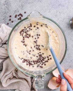 Combine the wet and dry ingredients: Pour the wet mixture over the dry ingredients and gently fold until just combined. You will still see lumps —just let them be (trust me! You do not need to overmix the batter! Overmixing makes pancakes dense. Next, fold in the chocolate chips or whatever fruits you would like to use here.