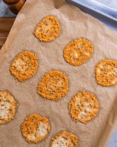 Parmesan crisps: Make, cool, and store in an airtight container at room temperature for 3-5 days.
