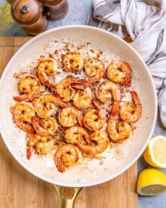 - To help the shrimp brown, pat them dry thoroughly before searing and don’t overcrowd the skillet (cook in batches, if needed).