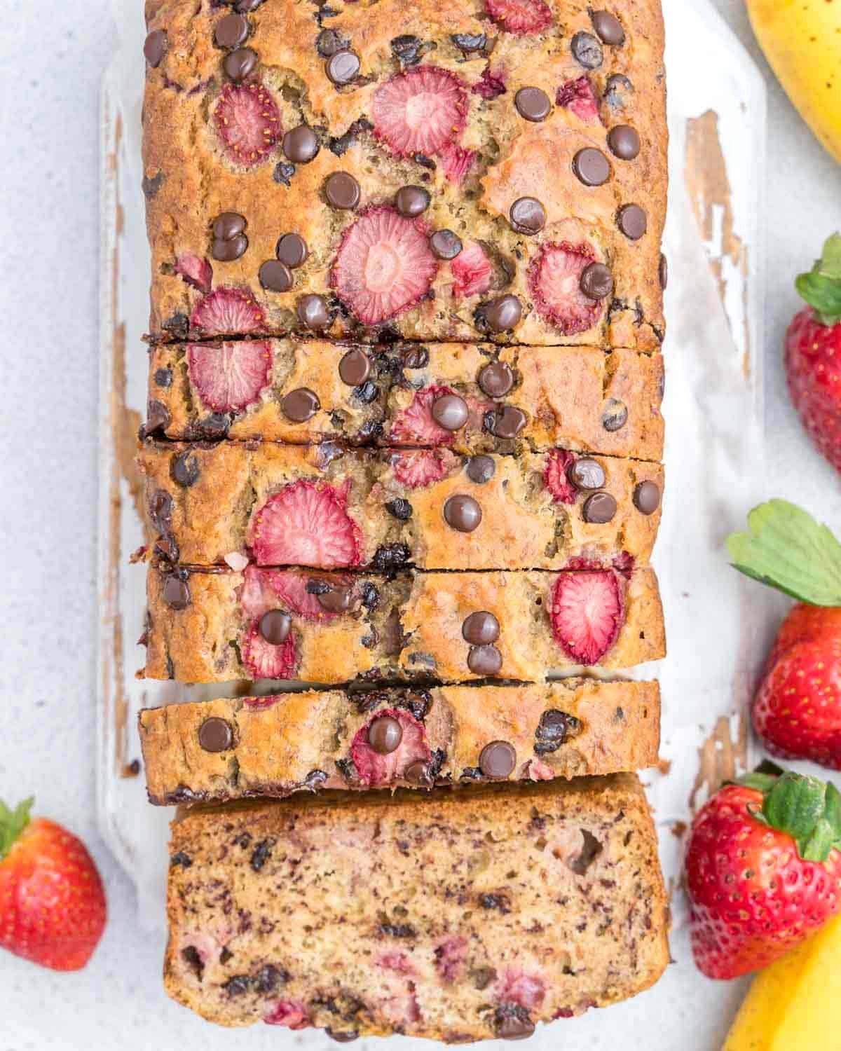 Below are the ingredients I used to make this chocolate chip strawberry banana bread. Full measurements are further down in the recipe card.