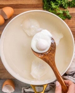 - Vinegar: Added to the water for poaching the eggs. It helps the egg whites set quickly, maintaining their shape.