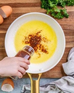 - Melt the 1 tablespoon unsalted butter and 1 tablespoon olive oil in a small pan over medium heat. Once melted and slightly foamy, add 1 teaspoon Turkish red pepper flakes or crushed red pepper flakes and ½ teaspoon smoked paprika. Cook for 15 seconds, then remove from heat.