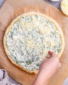 I was inspired to make white pizza after having it at a restaurant a few months ago. I thought it was delicious, and I wanted to recreate it, but with a healthier dough. If you’ve ever made the viral 2-ingredient bagels, you’ll know how magical the combination of Greek yogurt and self-rising flour is. It forms a simple bread dough that doesn’t require yeast, so it can be made with minimal kneading and no resting time. It’s perfect for things like the pizza crust in this recipe, which makes weeknight pizza not only possible but super easy!